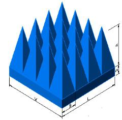 吸波角锥是一种由浸炭黑的轻质聚氨酯泡沫塑料制成的宽带吸收体,广泛用于各种电波暗室内壁铺装。在垂直入射和斜入射条件下,具有极好的宽带性能,同时还具有良好的散射和隔离衰减性能,适合于暗室内的各个部位。此材料具各种不同高度,以满足不同的技术需要。